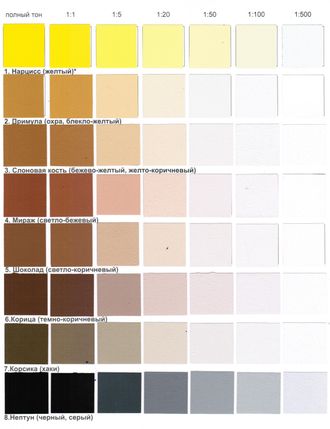 Колеровочные пасты на акриловой основе: Нарцисс, Коралл, Кармен, Триумф, Бордо, Дюшес, Океан.